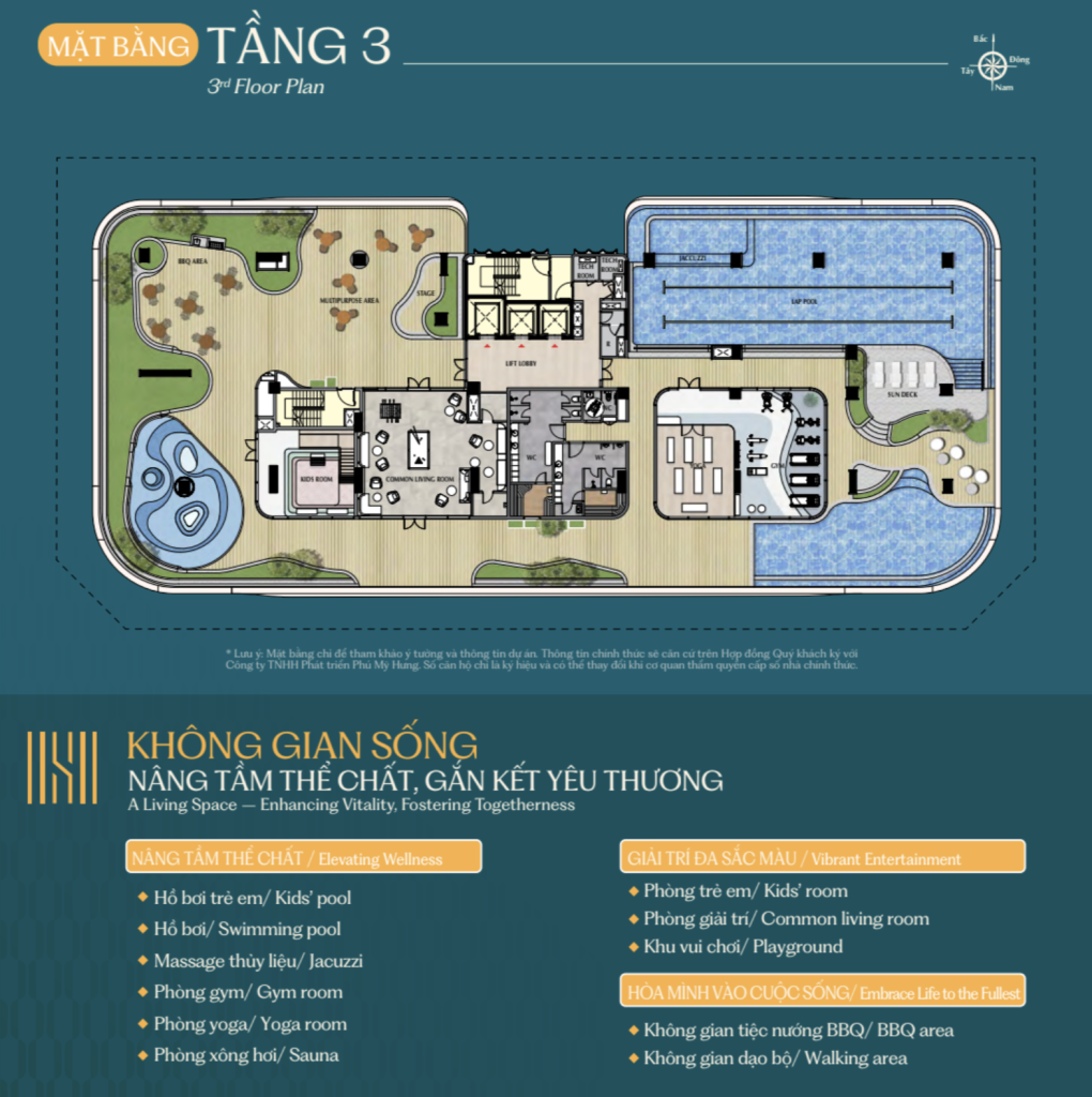 Các tiện ích đặc sắc đều được tập trung ở tầng 3 để cư dân có thể dễ dàng sử dụng một cách thuận tiện và hoàn toàn riêng tư, có thể kể đến: hồ bơi kính, phòng tập gym cao cấp, khu vui chơi trẻ em ngoài trời và trong nhà vv…